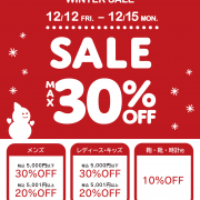 - 【2025 WINTER SALE】 最大30%OFF開催!買取王国・良品買館では、お手頃価格のリユース品が更にSALE価格でお買い求めできる衣料品WINTER SALEを、12月12日(金)から店舗限定で開催いたします。