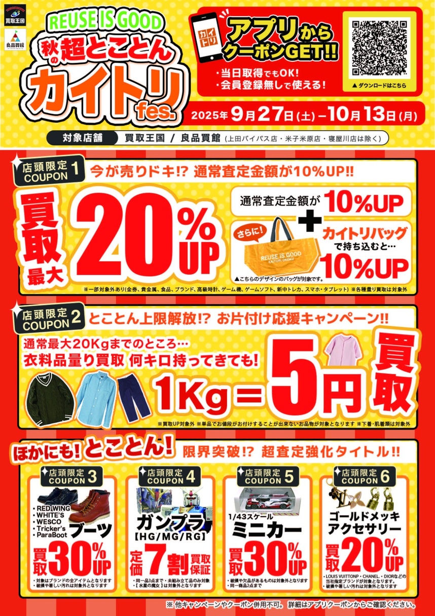 買取王国・良品買館では2025年9月27日(土)~10月13日(月)までの期間『秋の超とことんカイトリFes.』を実施致します。